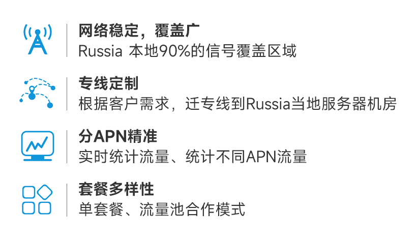 合作核心運營(yíng)商在俄羅斯移動(dòng)通信市場(chǎng)占有率第一和用戶(hù)口碑較高,是廣大海外客戶(hù)優(yōu)先選擇的通信運營(yíng)商。
